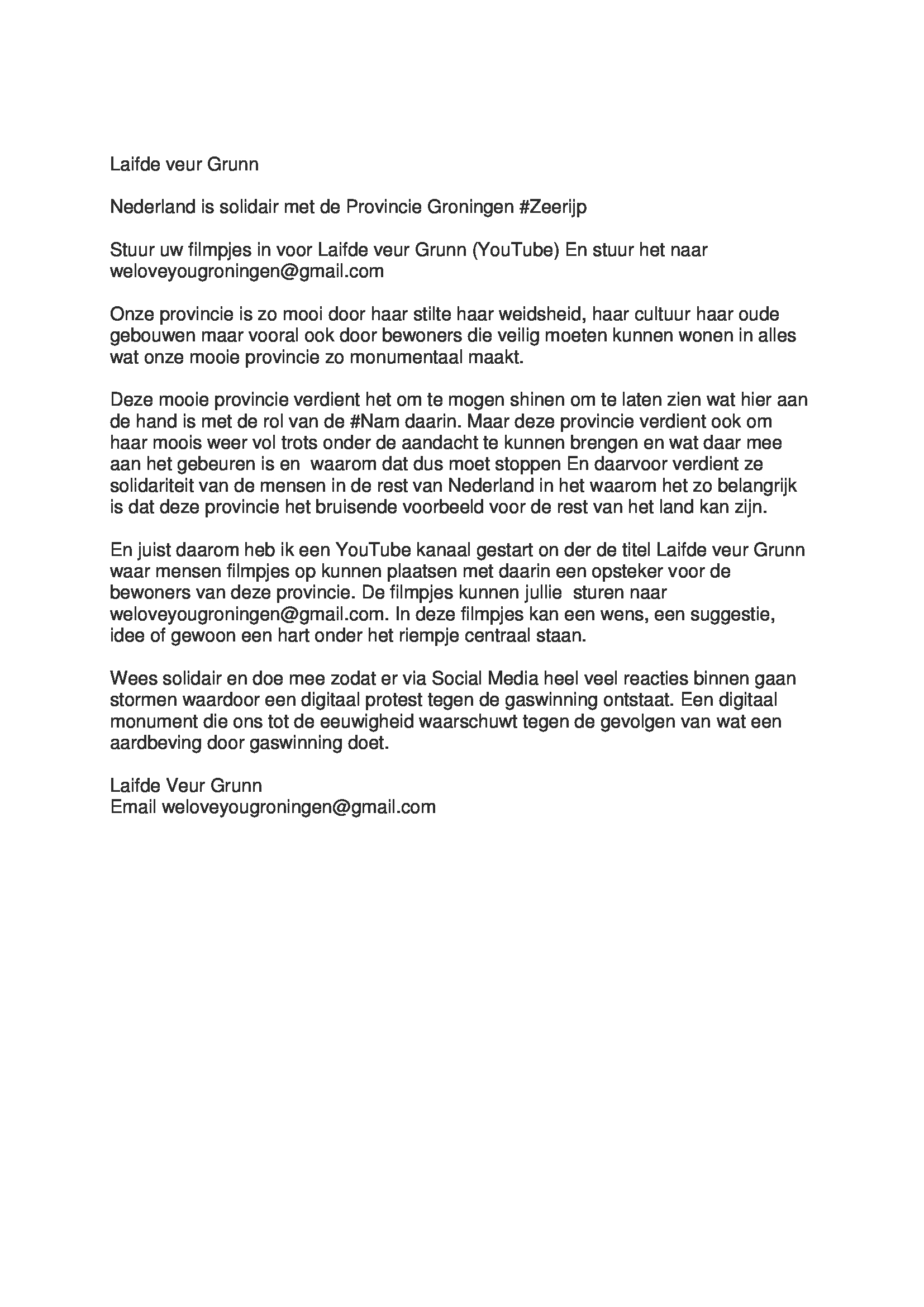 Vorige afbeeldingVolgende afbeelding 1-Laifde-veur-Grunn Laifde veur Grunn weloveyougroningen@gmail.com You Tube Project over de bevingen in Groningen