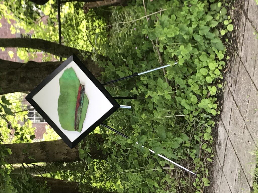Vorige afbeelding IMG_8036 Species are at stake, mixed media on bark and wood 60 x60 Installation on wood